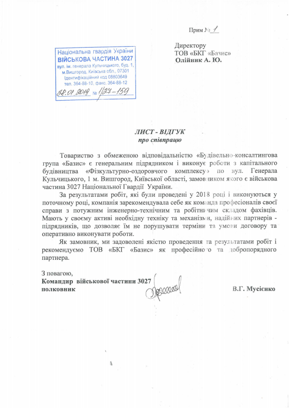 The Company has many positive reviews in organizations based on the results of the services provided: CE "Department of Capital Construction" of Zaporizhzhya City Council, Department of Urban Economy Development and capital construction Bakhmut City Council, National Guards of Ukraine, Luhansk regional state administration and others.
