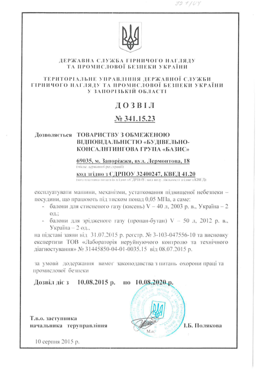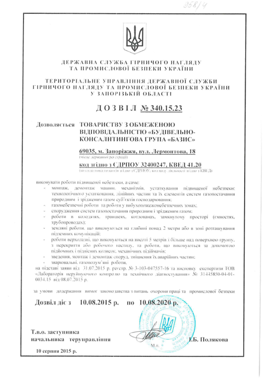 - permission of the State service for mines inspection and industrial safety of Ukraine for: